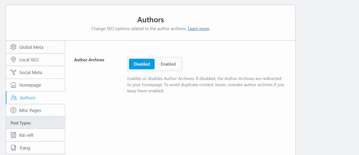 Để nhanh gọn nhất và tránh bị trùng lặp nội dung bạn hãy chọn disabled, khi bật tùy chọn này plugin sẽ tự động chuyển hướng url tác giả đến trang chủ, tùy vào cài đặt bạn có thể enabled, nhớ set thêm noindex để tránh bị trùng lặp nội dung.